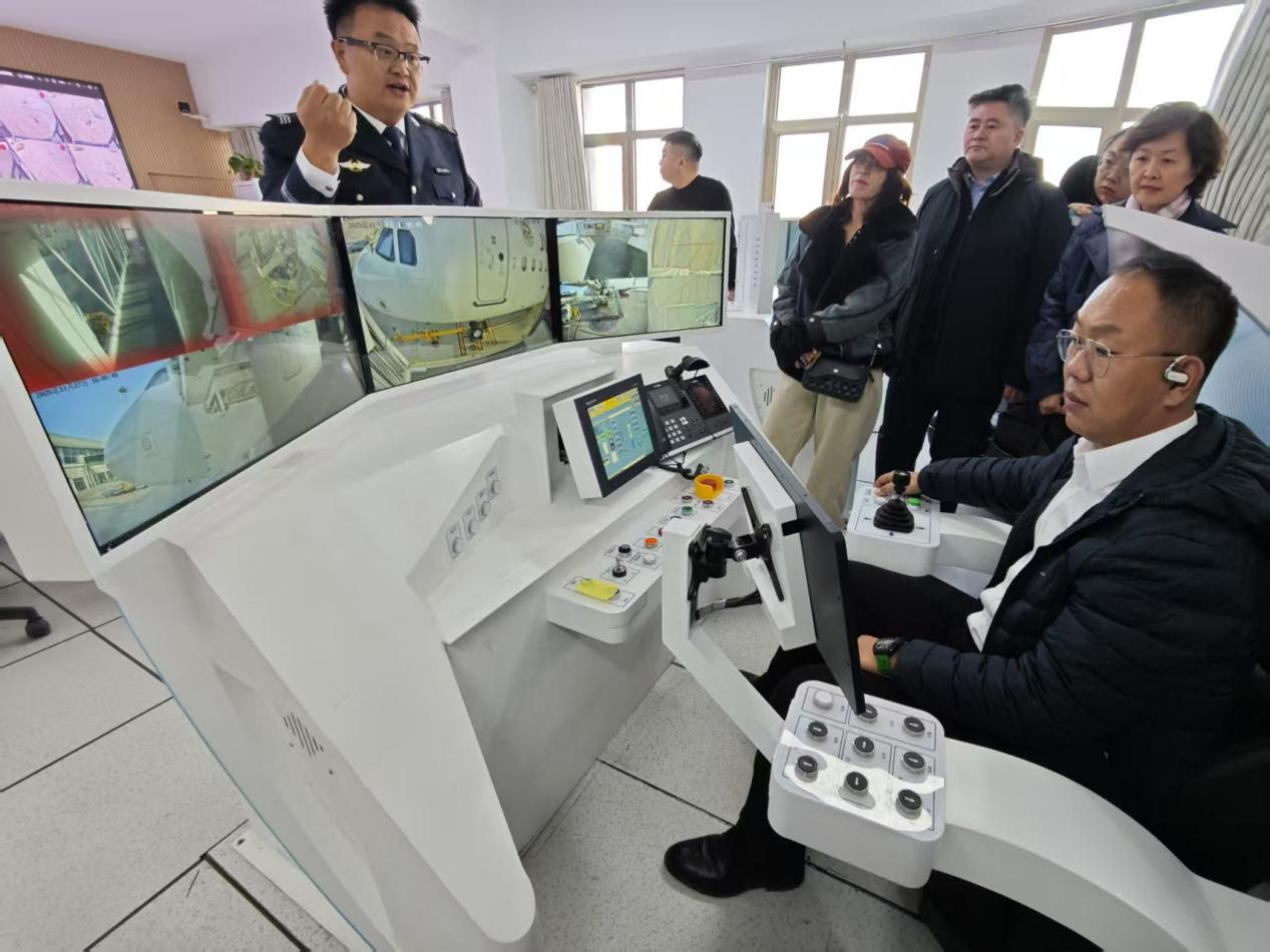 签约仪式后,在郄波与李晓海的带领下,党员同志们先后参观了包头机场空管培训中心与登机桥远程管控中心。在空管培训中心,大家通过模拟雷达系统、航班调度模拟平台,直观了解了空管工作对航班安全的重要性;在登机桥远程管控中心,李晓海详细演示了远程操控登机桥对接流程、设备状态实时监测系统,介绍了智能化技术在提升机场运行效率中的应用。