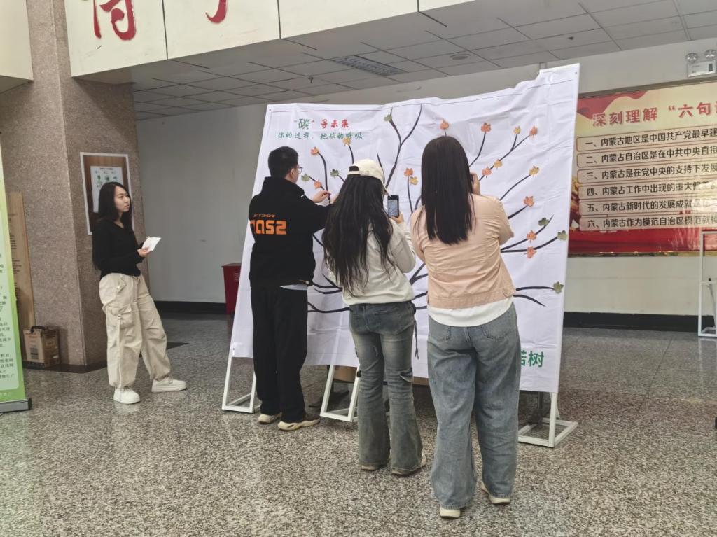 本次活动的成功举办,离不开内蒙古达索时代科技有限公司与内蒙古启明生物科技有限公司-草地植物研发中心的鼎力支持。两家企业主动参与、积极赋能,为校园低碳科普实践行动的顺利开展提供了有力保障,让绿色低碳理念在校园落地生根、开花结果。活动现场,同学们积极参与低碳问卷调研、科普易拉宝宣传、趣味游戏互动、绿色承诺树打卡等多项实践环节。同学们认真学习低碳知识,自主选择低碳减排行为,将绿色承诺写在叶片便利贴上并张贴于承诺树展板,同时通过朋友圈分享低碳行动,主动为校园低碳建设建言献策。在沉浸式参与中,不仅深化了大家对低碳生活的认知,而且切实将生态环保理念内化于心、外化于行。