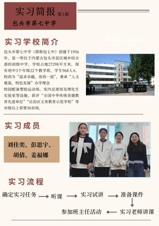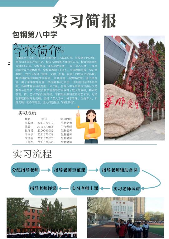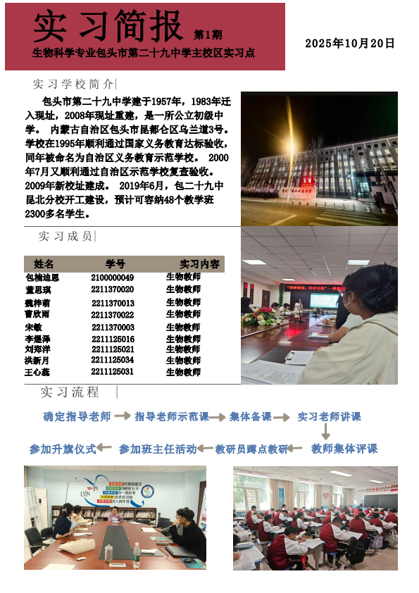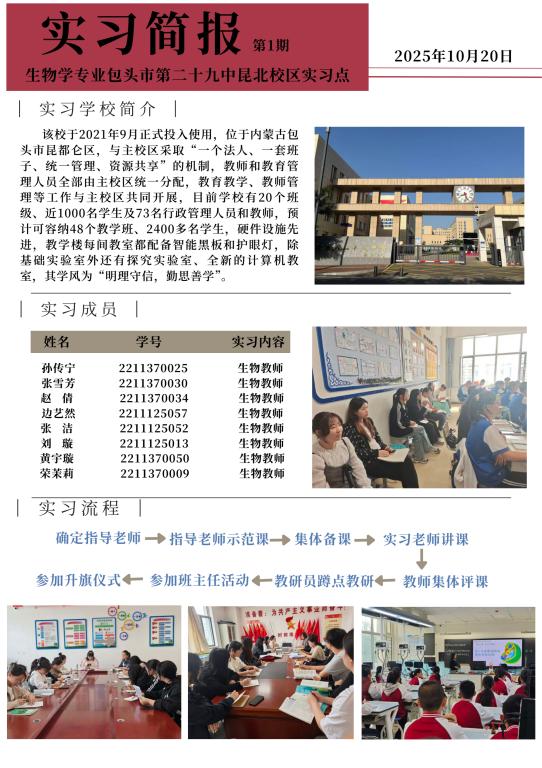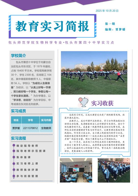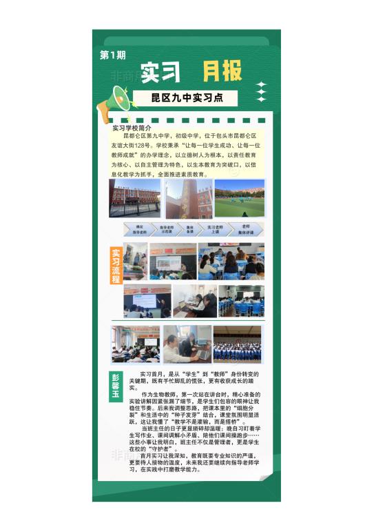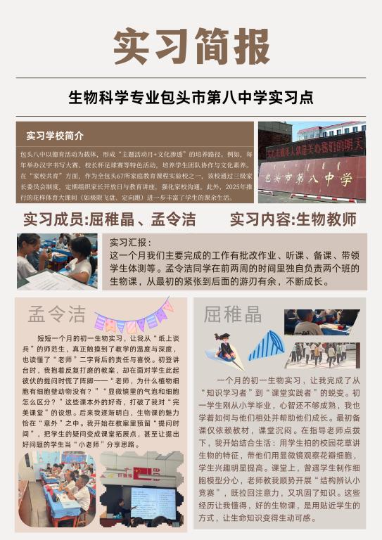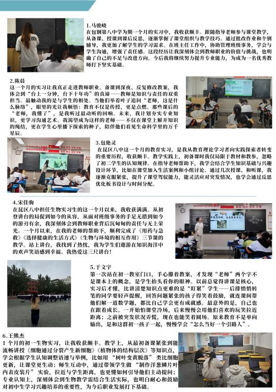 为期13周的教育实习全面启动,2022级生物科学专业师范生共122人已于9月15日分赴包头市、呼和浩特市等地中学开展实习。此次实习不仅为学生提供了巩固专业知识、提升教育教学能力的平台,也让他们在真实的课堂环境中感悟教师职责、锤炼职业素养。各实习学校高度重视本次实习工作,举行了形式多样的交流活动,对我院实习生和带队指导教师表示诚挚欢迎,并为实习生活和教学安排提供了细致周到的保障,为实习顺利开展奠定了良好基础。