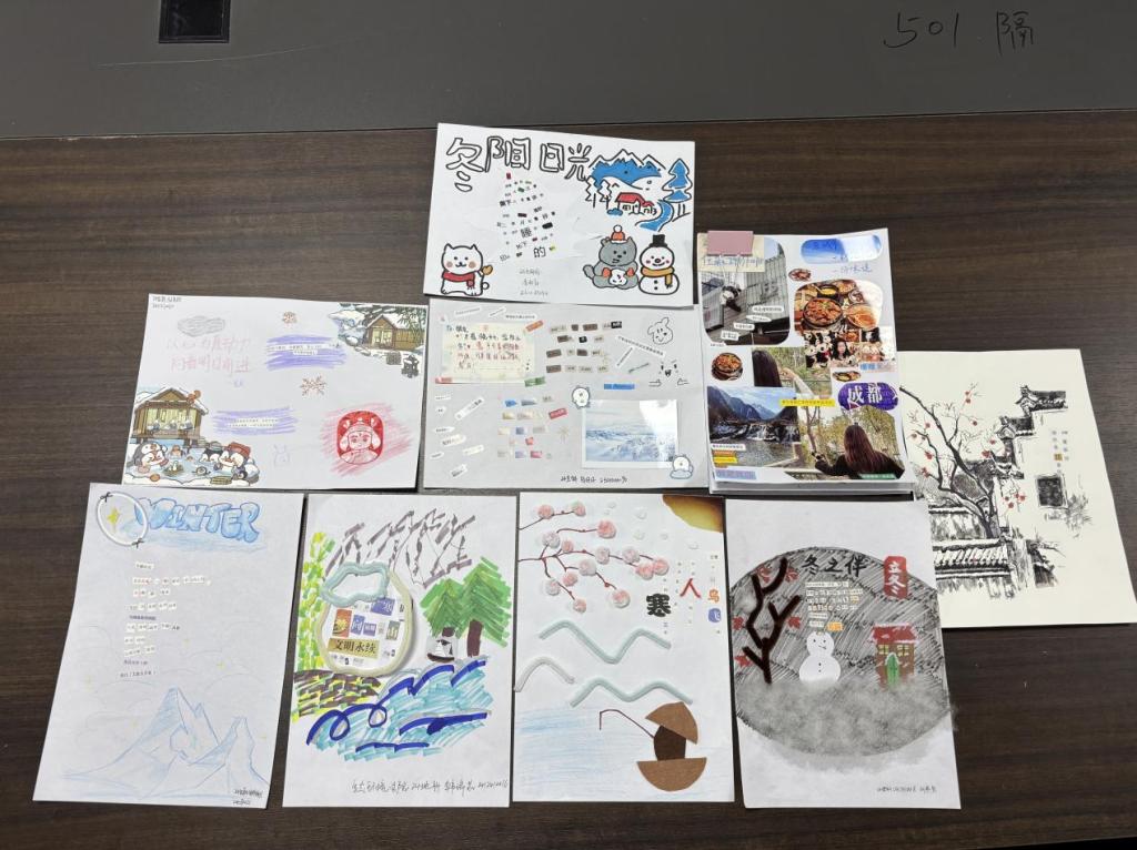 活动现场创意涌动,同学们以多元形式呈现拼贴诗作品,每一件都藏着对冬日的独特观察与巧思:水墨风格作品以素笔勾勒古韵建筑与红梅枯枝,留白处搭配“万壑覆银纱”的诗句,传递出冬日的古典韵味;照片拼贴作品用生活影像串联成都暖食与北方皑雪,配“烟火裹寒味,远山藏素冬”的短句,让不同地域的冬日气息在纸间交织;立体剪纸作品以手工造型呈现雪人、木屋,旁缀“冬之伴”的自创诗句,错落的剪纸层次里藏着冬日的温柔烟火。每个充满质感的作品,尽显青春创意与文字魅力。经过评委细致的评选,活动最终评出一等奖1名、二等奖2名、三等奖3名及优秀奖3名。