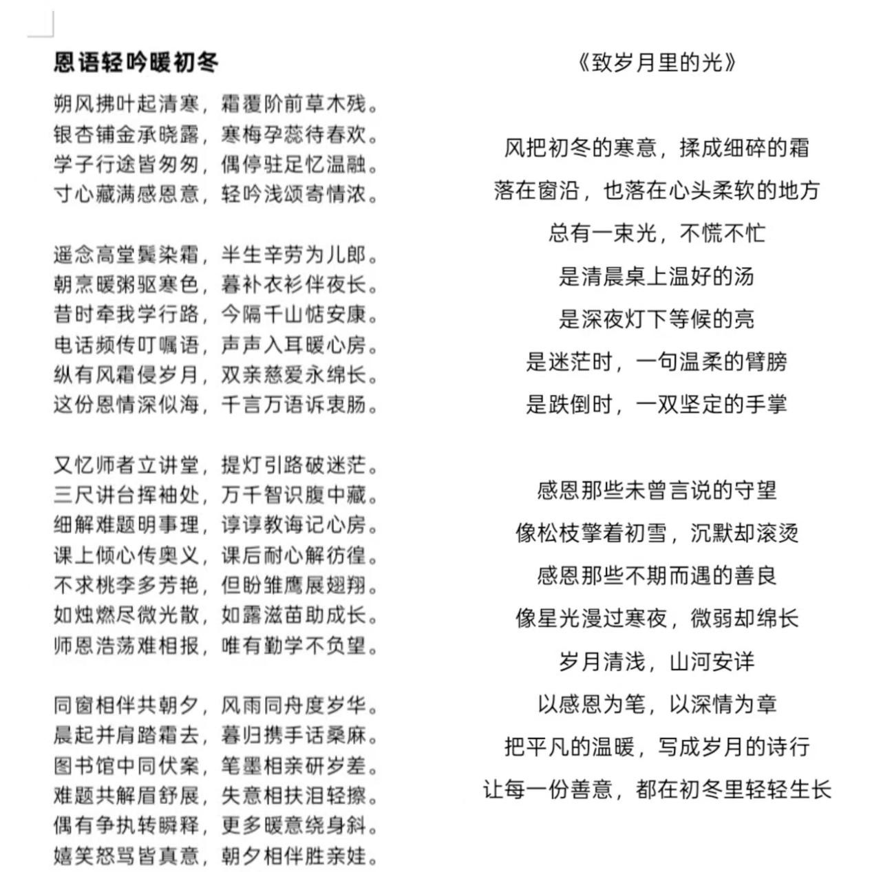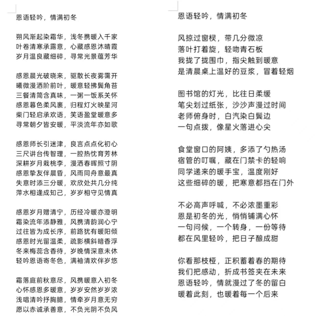 本次活动创新采用“线上征集+线下评审”模式,既打破空间限制,方便学子灵活参与,又通过专业评审保证结果公平公正,吸引了众多诗词爱好者踊跃报名。线上征集阶段,选手们精心录制音视频作品,多以初冬景致起笔,铺陈父母养育、师长教诲、同窗相伴之暖,以真挚嗓音勾勒岁月暖意,让听众在诗韵中沉浸式感受感恩的力量。经过评委们认真评审,从吐字发音、情感表达、节奏把控等维度细致打分,活动最终评选出一等奖1名、二等奖2名、三等奖3名及优秀奖4名。