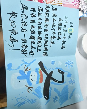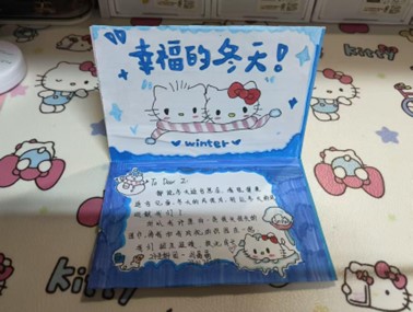 比赛自启动以来,得到了同学们的积极响应。大家围绕“冬意”与“关爱”两大核心,将对冬日美景的感知、对亲友师长的祝福、对生活的热爱融入作品之中。创作中,同学们巧用彩纸、丝带、干花、纽扣等多种材料,或剪折、或绘制、或粘贴,手法新颖多样。有的以雪花、松枝、雪人等元素勾勒冬日景致,画面灵动逼真;有的以文字倾诉真挚情谊,字句温暖动人;还有的融入环保理念,利用废旧材料打造创意作品,尽显低碳智慧。每一张贺卡都独具匠心,细节处彰显巧思,色彩间流露温情,承载着同学们最纯粹的情感与最美好的期盼。