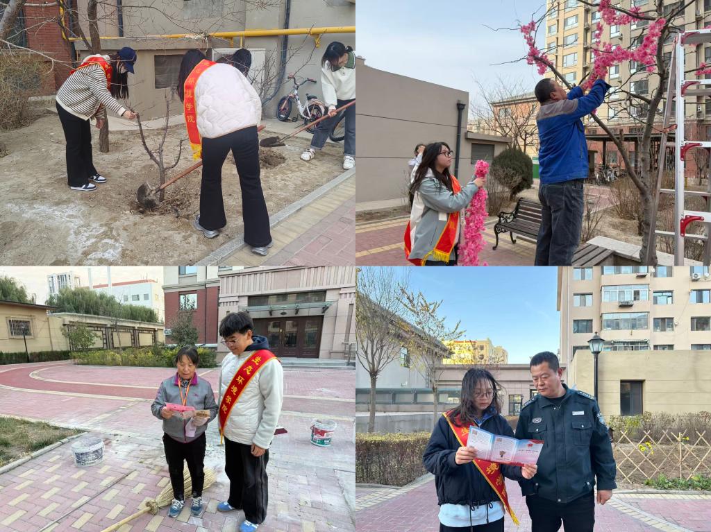活动当天,志愿者们深入社区一线,协助工作人员开展环境布置与设施整理工作。志愿者们主动接过工人师傅手中的工具和材料,配合完成现场布置任务,展现出不怕苦、不怕累的精神风貌。志愿者们协助完成植树布置任务,在劳动中感受奉献的快乐,也用汗水为社区增添了一抹新绿。在劳动间隙,志愿者们还与社区保安亲切交谈,了解他们的日常工作与生活情况,拉近了青年学子与基层工作者的距离,也让同学们在平凡岗位中感受到坚守与奉献的意义。