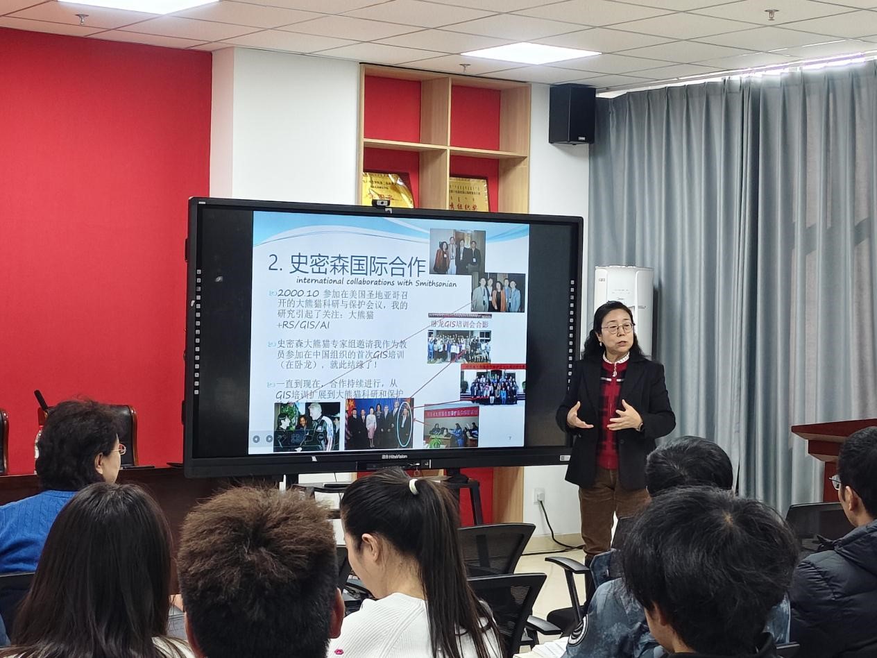 讲座中,刘教授以“抓住机遇、紧跟国需、做好自己、规划未来”为主线,结合自身三十余年的科研与教学经历,生动讲述了她从大熊猫研究起步、与国际史密森学会合作、到进入清华大学执教的成长历程。她重点分享了如何将遥感、地理信息系统、人工智能等现代技术应用于生物多样性保护、环境影响评价、水环境治理、自然资源核算、生态修复等国家重大需求领域,并以山西煤矿生态修复、大熊猫栖息地恢复、南海永兴岛生态规划等典型案例,展示了科技在生态保护中的重要作用。